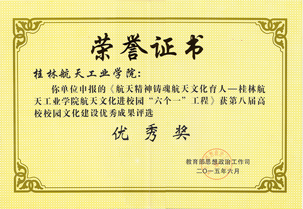 近日,2015年全国高校校园文化建设优秀成果评选揭晓。我校报送的《航天精神铸魂航天文化育人——桂林航天工业学院航天文化进校园“六个一”工程》荣获全国优秀奖,这是我校在文化传承创新领域获得的首个国家级奖励,也是我校在发挥高校四大职能方面取得的又一项国家级标志性成果。