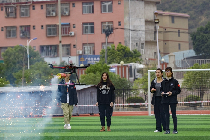 电子信息与自动化学院无人机遥感遥测重点实验室上演了穿越机花式飞行表演。穿越机最高时速可超过200公里每小时,百公里加速不到2秒,精彩的表演赢得了现场观众的阵阵惊呼,该项目连续三年在广西高校无人机大赛中取得优异成绩。
