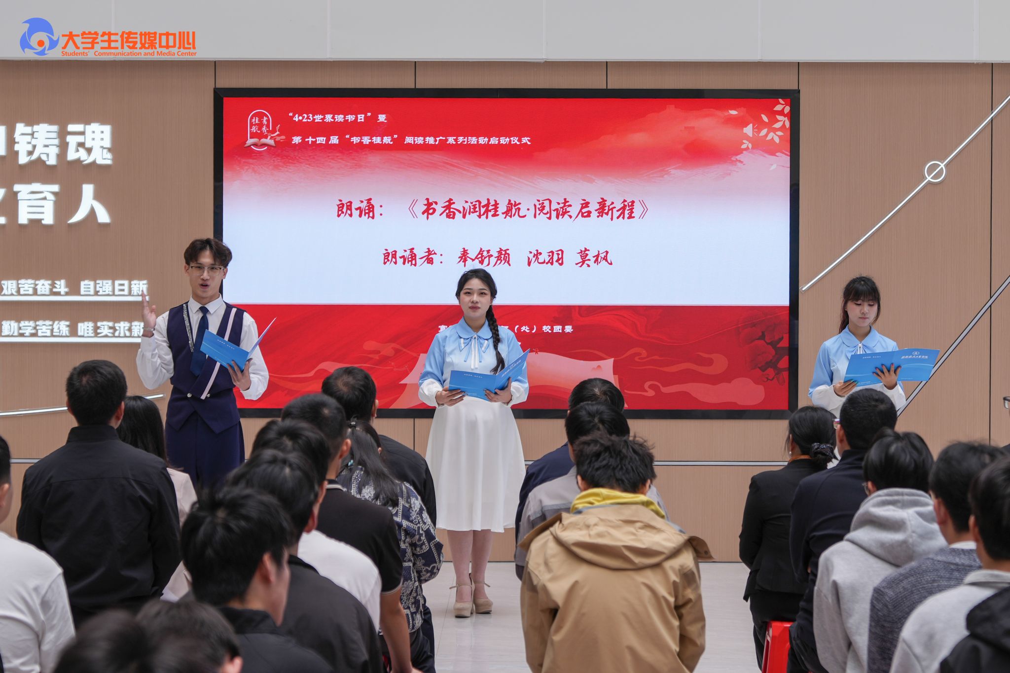 4月23日上午,学校2026年“4·23世界读书日”主题活动暨第十四届“书香桂航”阅读推广系列活动启动仪式在问天楼图书馆举行。学校党委常委、副校长张立国出席启动仪式并致词。校党委宣传部、学工部(处)、校团委、教务处、图书馆负责人、各学院领导以及师生代表100余人参加活动。
