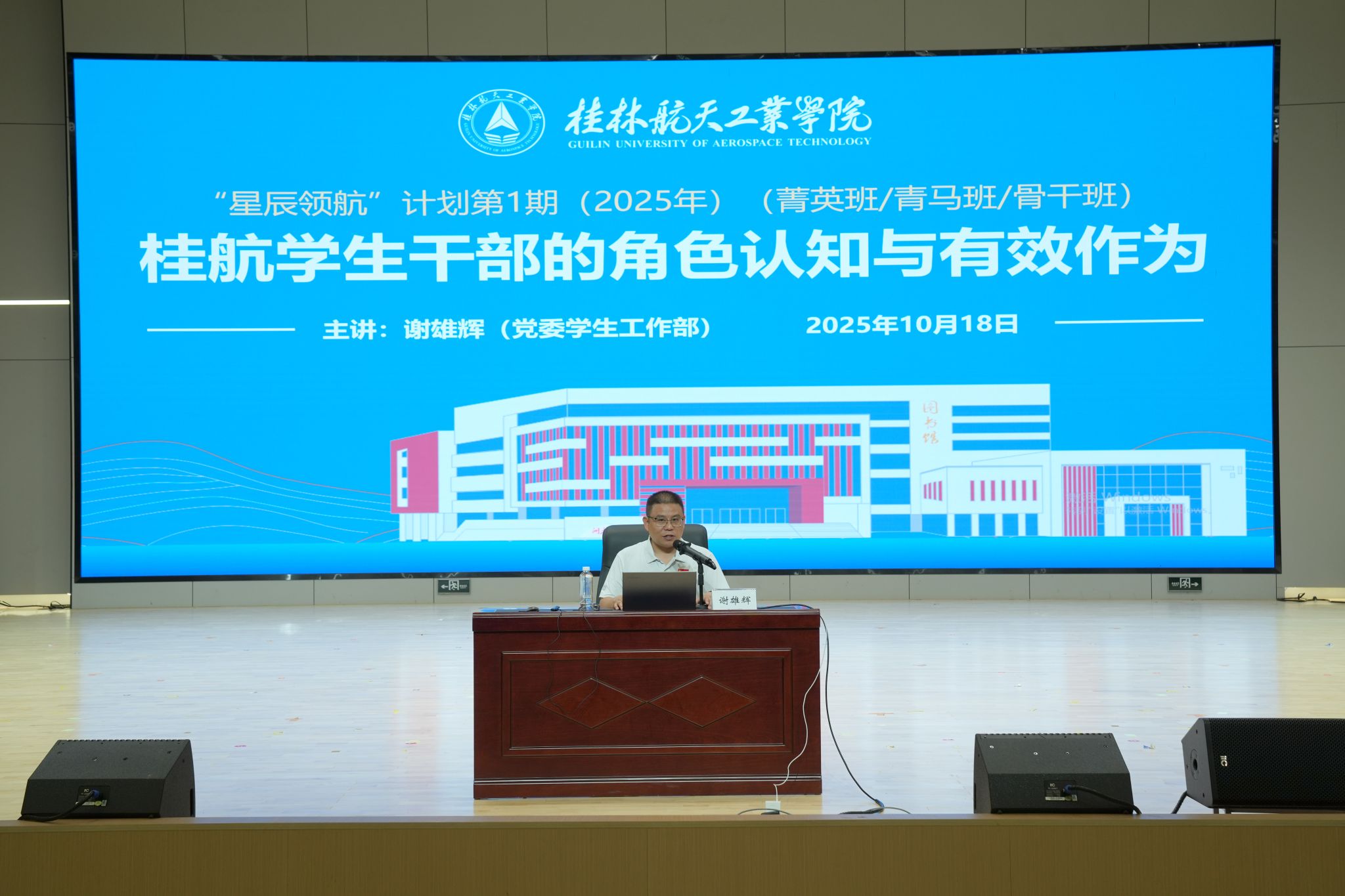 10月18日上午10:00,学校“星辰领航”学生骨干素质能力提升计划首期培训班第一讲在图书馆报告厅举行。学校党委学生工作部部长谢雄辉以“桂航学生干部的角色认知与有效作为”为题,为“星辰领航”计划菁英班、青马班、骨干班600余名学员进行首场培训。