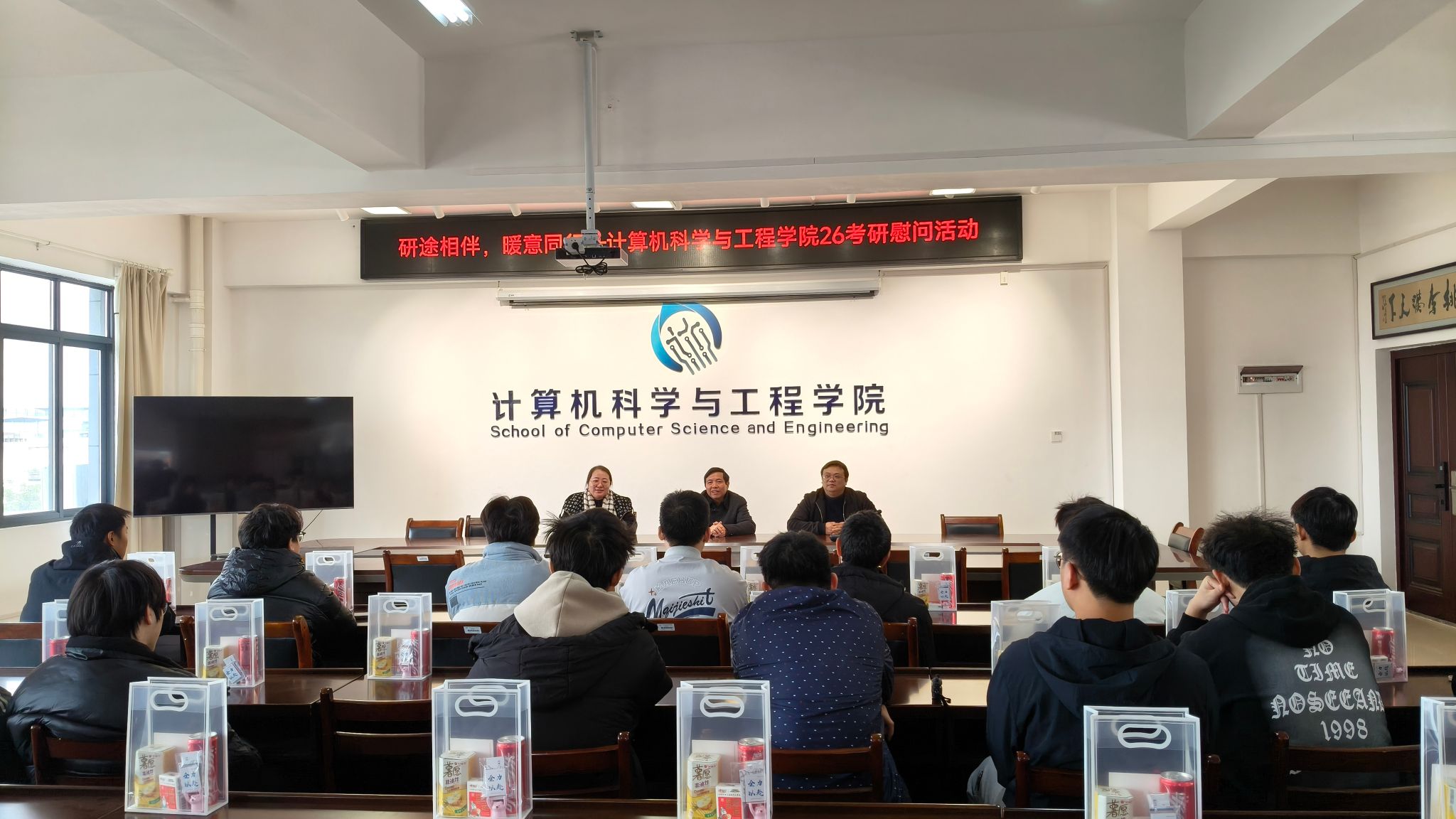 12月16日上午,计算机科学与工程学院“研途相伴,暖意同行—2026届毕业生考研慰问活动”在冬日暖阳中温情举行。活动旨在进一步关心关爱2026届考研学子冲刺阶段的备考状态,缓解心理压力,营造积极向上、相互支持的浓厚备考氛围。院党委书记杨小劲、院长魏星、院党委副书记刘莉湘君出席活动,代表学院向全力备考的同学们送上深切的关怀与真挚的祝福。