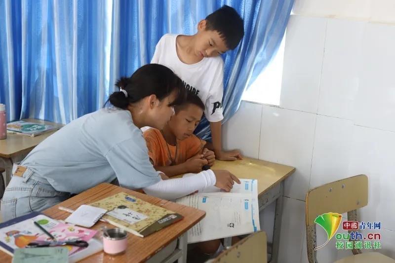 志愿者细心地为孩子辅导暑假作业,耐心讲解题目。唐建忠 摄