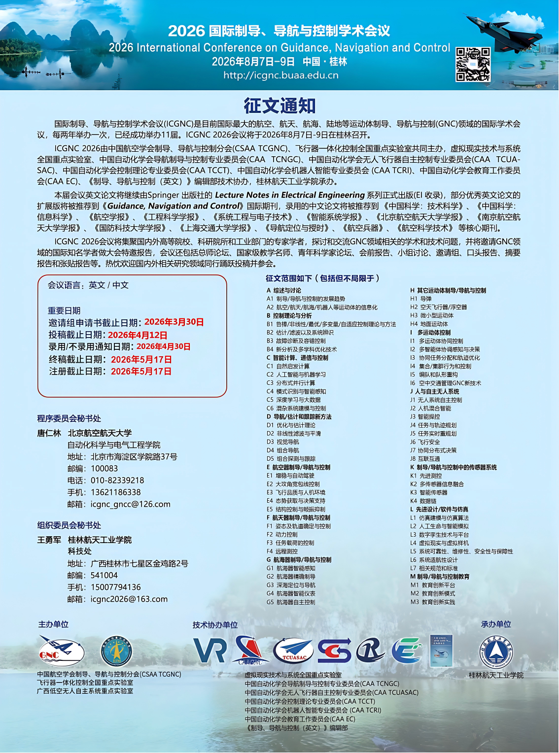 ICGNC 2026会议将于2026年8月7日-9日在桂林召开。本届会议由中国航空学会制导、导航与控制分会(CSAA TCGNC)、飞行器一体化控制全国重点实验室、广西低空无人自主系统重点实验室共同主办,虚拟现实技术与系统全国重点实验室、中国自动化学会导航制导与控制专业委员会(CAA TCNGC)、中国自动化学会无人飞行器自主控制专业委员会(CAA TCUASAC)、中国自动化学会控制理论专业委员会(CAA TCCT)、中国自动化学会机器人智能专业委员会(CAA TCRI)、中国自动化学会教育工作委员会(CAA EC)、《制导、导航与控制(英文)》编辑部技术协办,桂林航天工业学院承办。