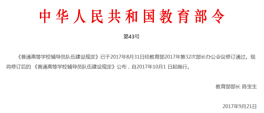 第二十二条 本规定自2017年10月1日起施行。原《普通高等学校辅导员队伍建设规定》同时废止。