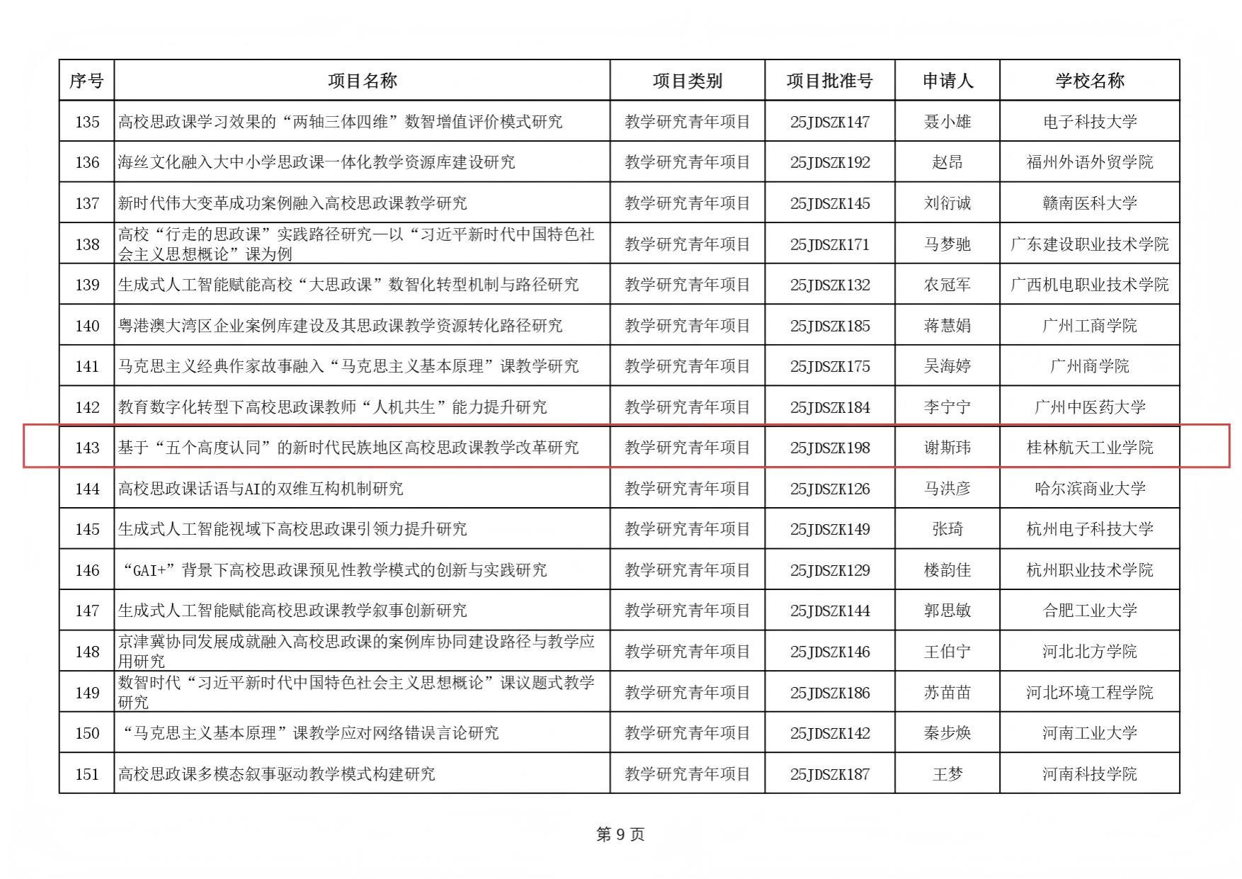 近日,教育部社科司发布了2025年度高校思想政治理论课教师研究专项一般项目立项通知,我校马克思主义学院教师谢斯玮申报的《基于“五个高度认同”的新时代民族地区高校思政课教学改革研究》获批立项。据悉,本次教育部高校思想政治理论课教师研究专项一般项目全国共有198项批准立项。此次立项,是学校深入落实立德树人根本任务,积极推动思政课建设内涵式发展的重要体现。