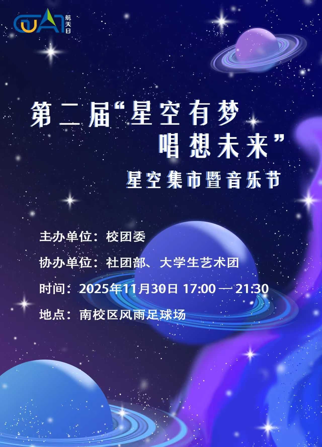 第二届“星空有梦,唱想未来”星空集市暨音乐节主办单位:校团委协办单位:社团部、大学生艺术团时间:2025年11月30日 17:00—21:30地点:南校区风雨足球
