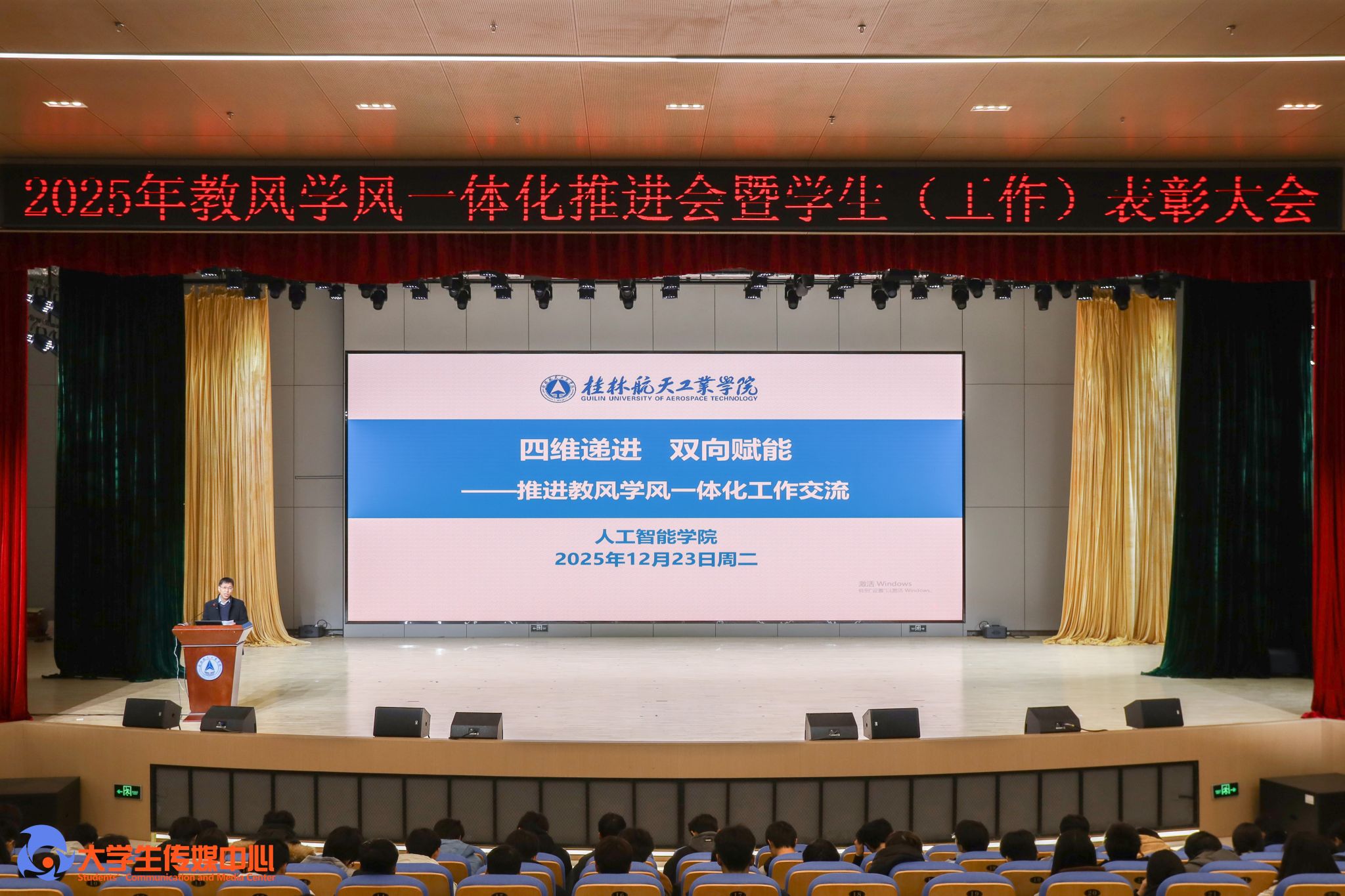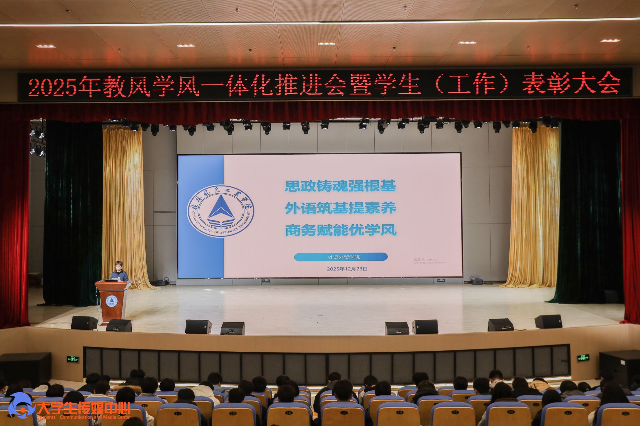 会上,在场师生共同观看了“星辰耀桂航领航起新章”2025年学生(工作)总结视频,大学生艺术团、钱学森班成员围绕大会主旨进行了歌舞、朗诵表演。国家奖学金获奖代表龚瑞雅同学、校长奖学金代表微小型飞行器实验室团队张宇嫣同学分别从个人发展、团队建设、科技创新等方面进行了交流发言;学工部(处)、教务处、人工智能学院和外语外贸学院主要负责人就教风学风一体化推进工作作了工作安排及经验交流。