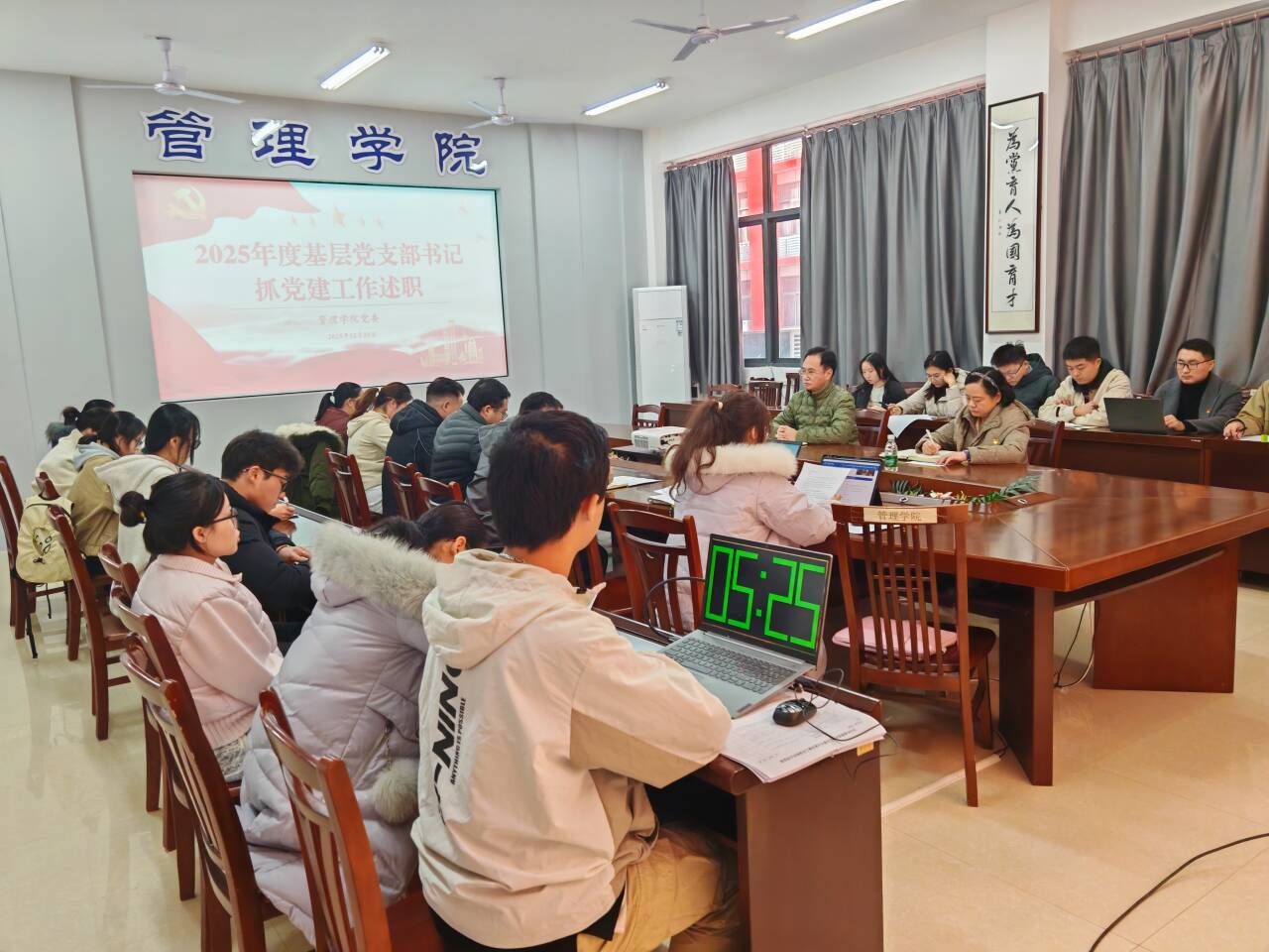 12月30日下午,管理学院党委召开2025年度党支部书记抓基层党建工作述职评议会。学院党委书记、副书记出席会议,学院全体党支部书记、各支部委员参加会议。