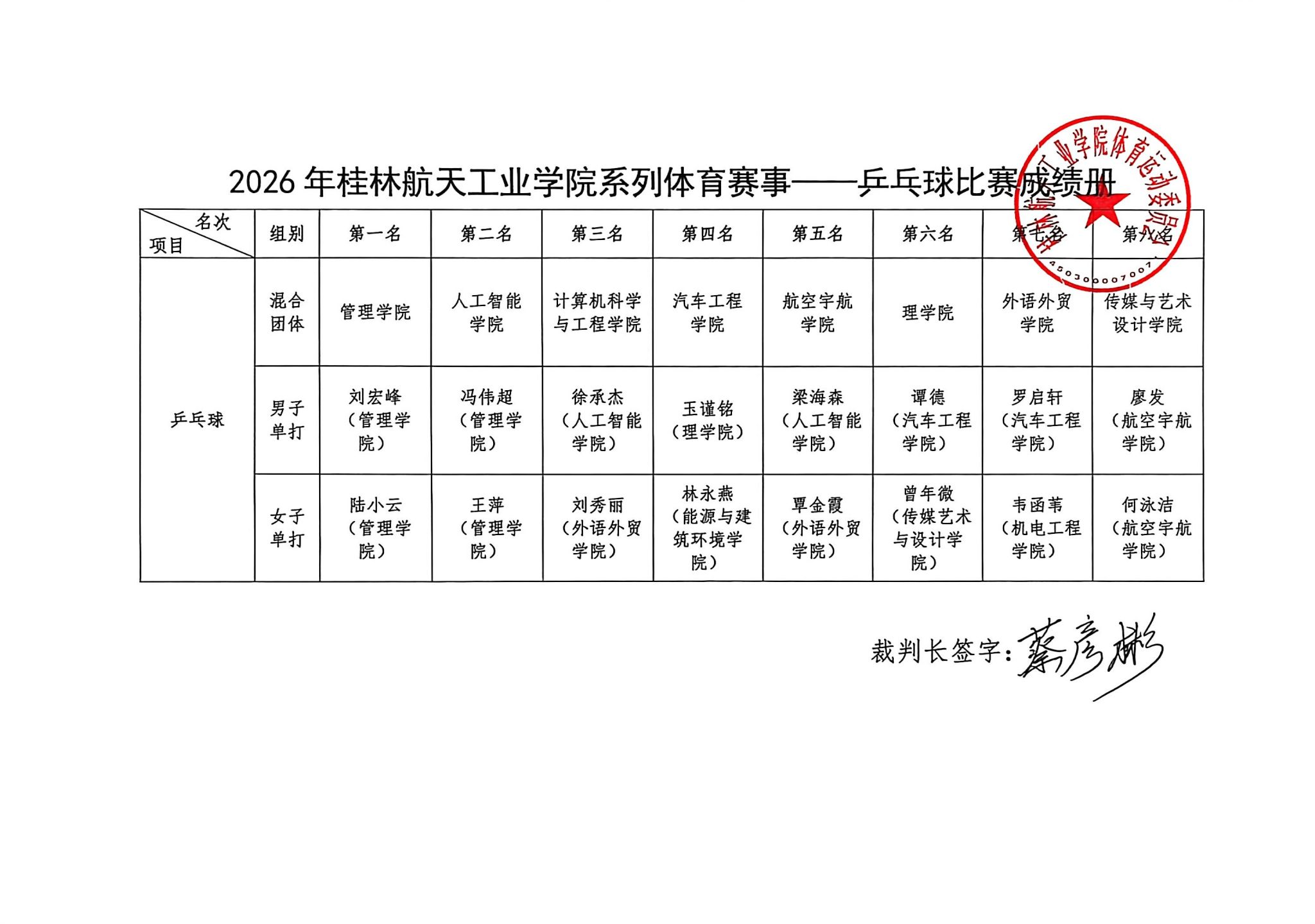 2026年3月29日,“2026年桂林航天工业学院系列体育赛事——乒乓球赛”在北校区乒乓球馆顺利闭幕。经过两天的激烈角逐,赛事在热烈、友好的氛围中圆满收官。