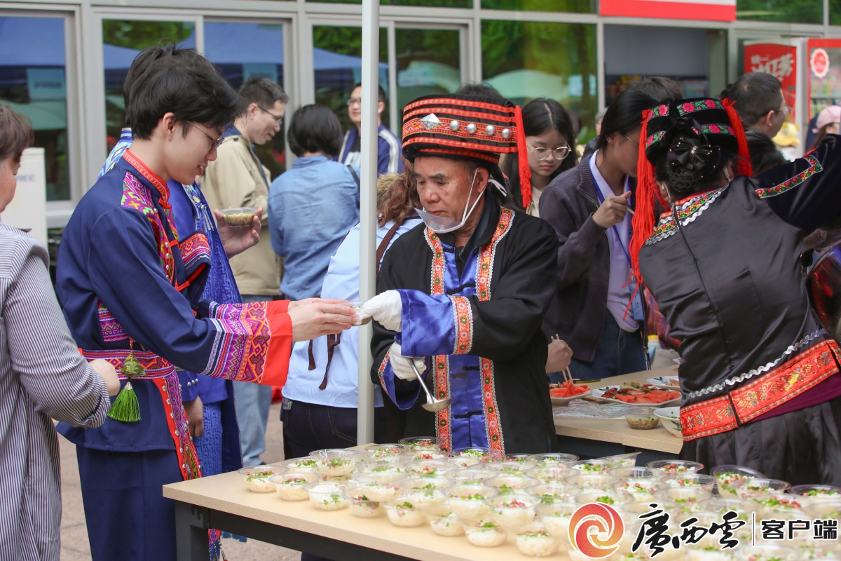 “广西三月三·桂航嘉年华”活动主会场现场,来自灌阳的非遗传承人带来油茶体验 华成涛 摄 分会场与各区域的体验活动亦高潮迭起:在一站式社区“快乐厨房”,师生们亲手制作五色糯米饭、打油茶、包粽子,在舌尖品味春色;问天楼图书馆前,跳竹竿、抛绣球等民族体育项目热火朝天;南北校区食堂门口,民族歌舞快闪瞬间将校园氛围拉满;而在“情暖三月三·民族大团圆”铸牢中华民族共同体意识主题晚会上,走秀《花漾诗篇·繁花逐光》以民族服饰与现代审美的交融,生动诠释了中华文化的多彩与包容。