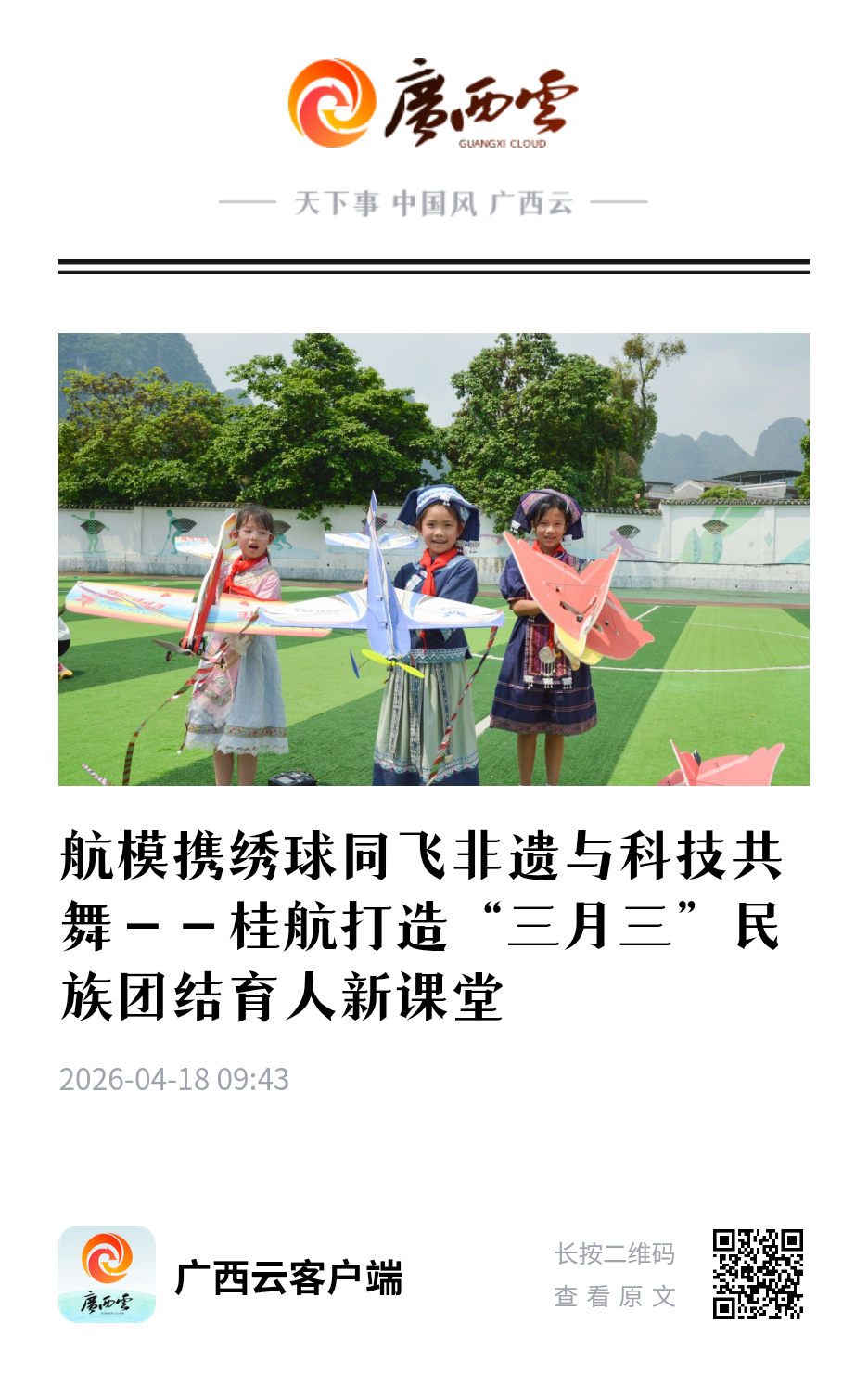 喝油茶、对山歌、抛绣球、飞航模……近日,桂林航天工业学院以广西三月三为契机,将民俗传承与航天特色深度融合,打造了一场别开生面的“科技+艺术”民族文化盛宴。桂航通过“航天+”赋能传统节日,让中华民族共同体意识在体验与共创中深植师生心田。 在桂林市草坪回族希望小学,桂航师生为当地师生带来了“科技+艺术”的双重联动,桂航航天飞行表演队表演的“蓝天课堂·雏鹰启航”航模飞行秀,将孩子们参与制作的壮族绣球、宋锦荷包带上蓝天,将广西三月三民族文化传承、非遗技艺体验与航天科技展示有机融合,用一声声稚嫩的惊叹和一张张兴奋的笑脸,将中华民族共同体意识牢牢刻画在未来一代的心中。