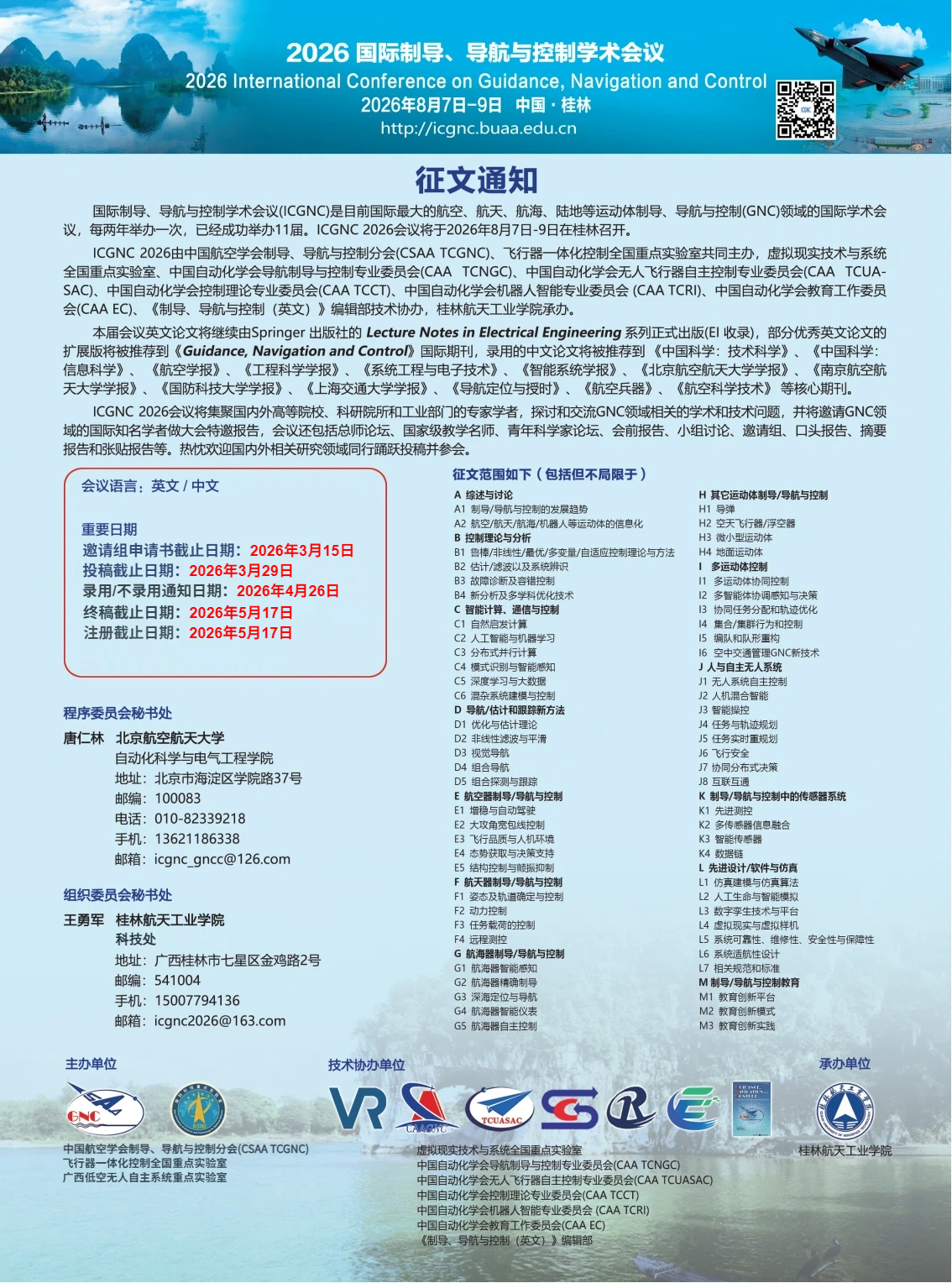 国际制导、导航与控制学术会议(ICGNC)是目前国际最大的航空、航天、航海、陆地等运动体制导、导航与控制(GNC)领域的国际学术会议,每两年举办一次,已经成功举办11届。ICGNC 2026将集聚国内外高等院校、科研院所和工业部门的专家学者,探讨和交流GNC领域相关的学术和技术问题,并将邀请GNC领域的国际知名学者做大会特邀报告。会议还包括总师论坛、国家教学名师论坛、青年科学家论坛、会前报告、小组讨论、邀请组、口头报告、摘要报告和张贴报告等。