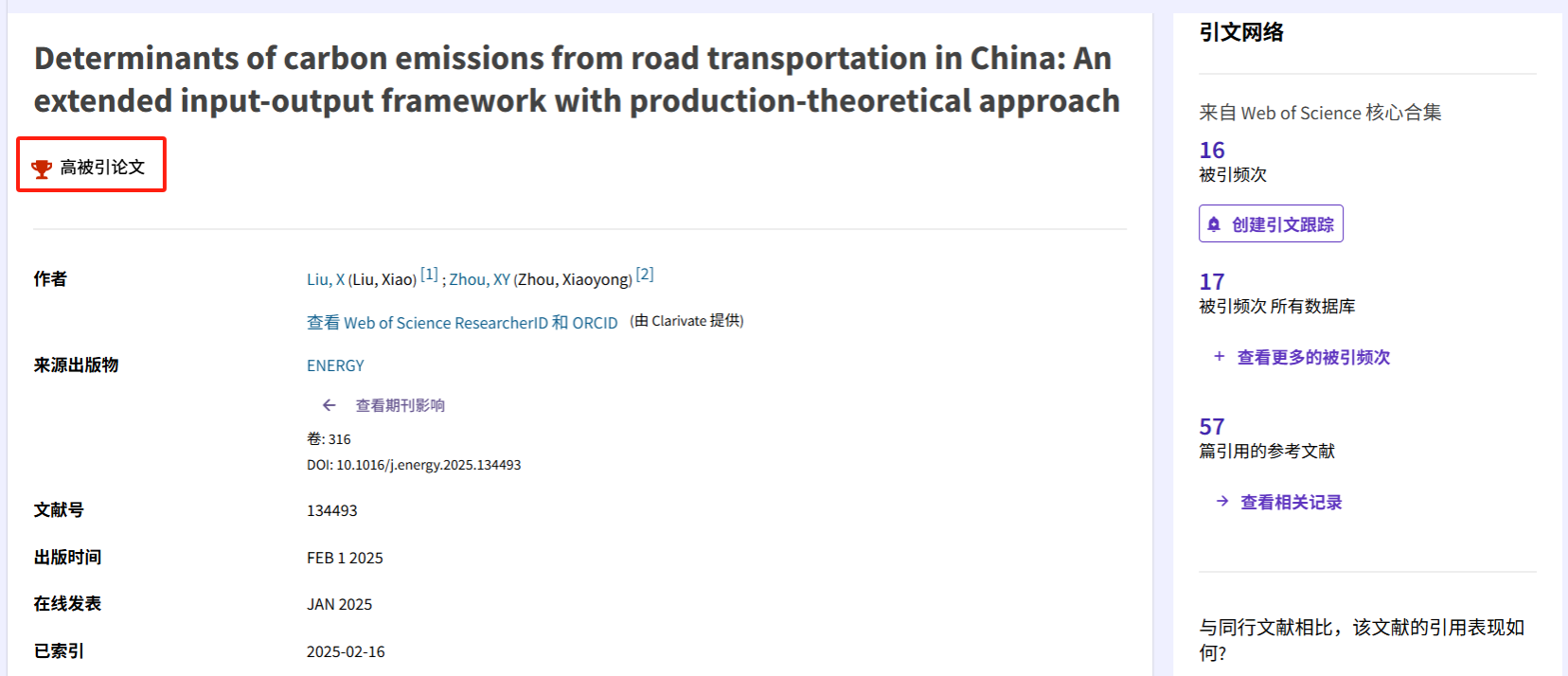 本次入选的研究论文《Artificial intelligence, corporate information governance and ESG performance: Quasi-experimental evidence from China》发表在金融学国际权威期刊《International Review of Financial Analysis》(中国科学院TOP,2024 IF: 9.8),采用多期双重差分方法实证考察中国国家人工智能试点政策对中国A股上市公司ESG表现的提升作用,证实人工智能通过增强企业信息治理——提高信息透明度、加强信息共享、降低信息不对称——显著提升了企业ESG绩效,能够为企业管理者有效发挥人工智能支撑公司治理与可持续转型作用提供参考。研究论文《Determinants of carbon emissions from road transportation in China: An extended input-output framework with production-theoretical approach》发表在自然科学类学科顶级期刊《Energy》(中国科学院1区TOP,2024 IF: 9.4),通过构建基于生产力论分解的扩展环境投入产出分析框架,从供需协同视角识别了中国道路交通碳排放变化的关键驱动因素,并指出实现道路运输低碳化转型需要全产业链的协同推进,能够为政府制定供给侧与需求侧协同的碳减排措施提供重要参考。