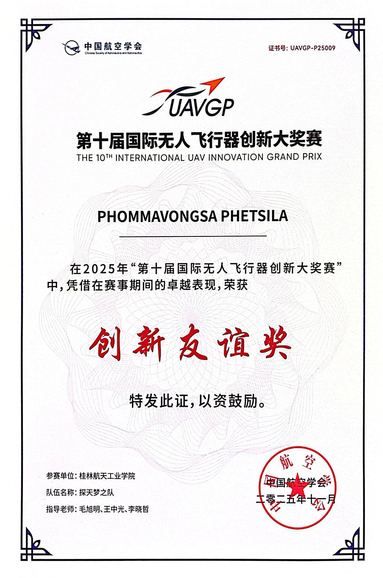 本届赛事由中国航空学会与自贡市人民政府联合主办,以“十载创翼、智启新空”为主题,设置智能垂直起降航空器创意设计赛、航空器实物飞行赛垂直起降组、航空器应用技能赛性能挑战组等多个竞赛单元。我校留学生组成的“探天梦之队”,凭借作品独具匠心的创新性与扎实可靠的技术可行性,历经专家评审团的严格遴选与多轮考核,成功斩获创新友谊奖。